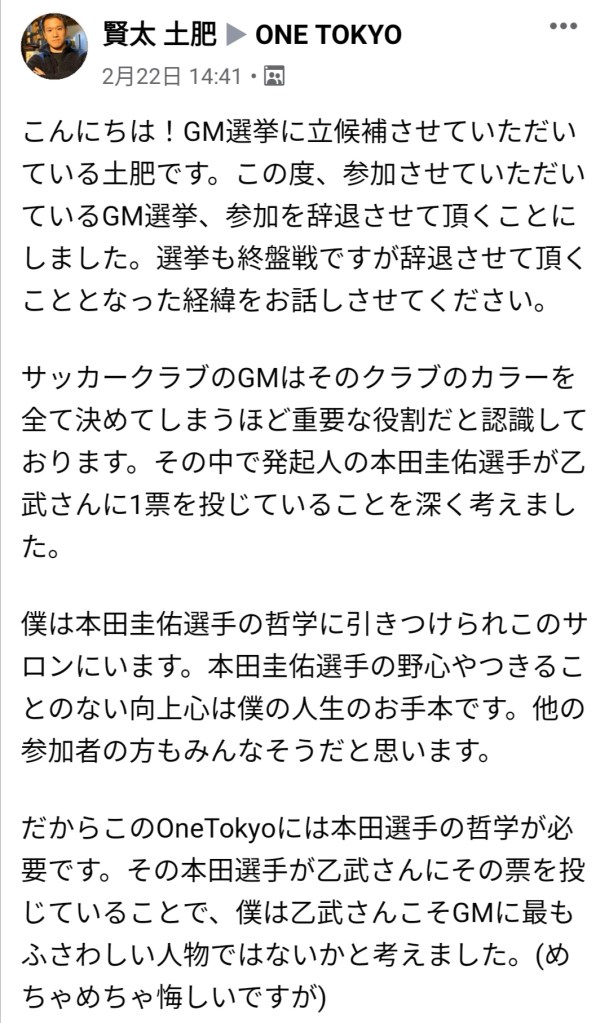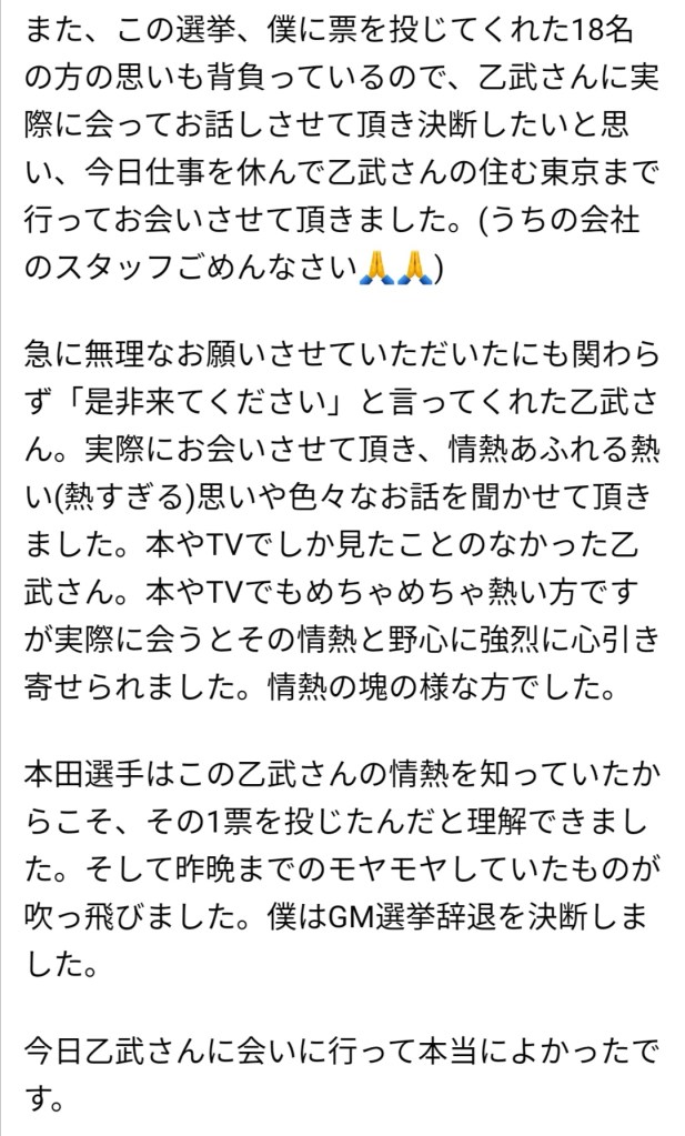 本田さんご自身もGMへ立候補される予定でしたが、立候補者のあまりにも熱いアピールを見て監督選挙に引き続き、辞退されることに!