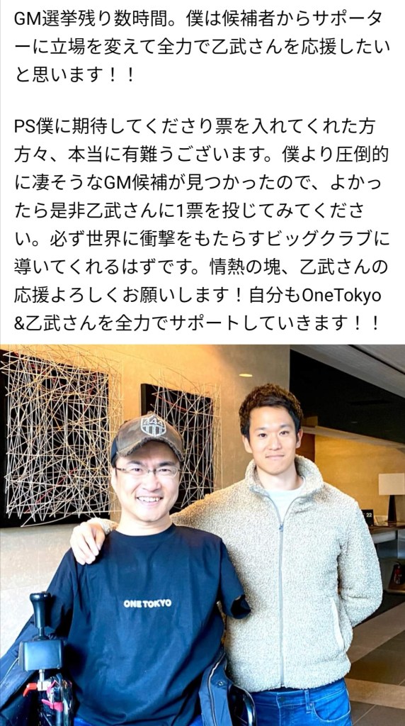 今後は、乙武GMのおっしゃる通り「ONE TOKYO」と言う名を実現する為に、ファミリーの皆が1つになって、より一層チームの結束力が高まれば良いなと思います。
