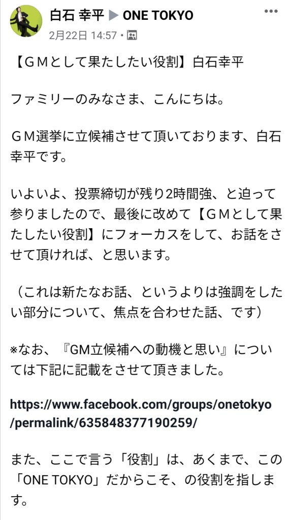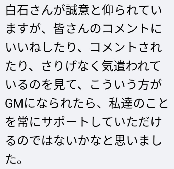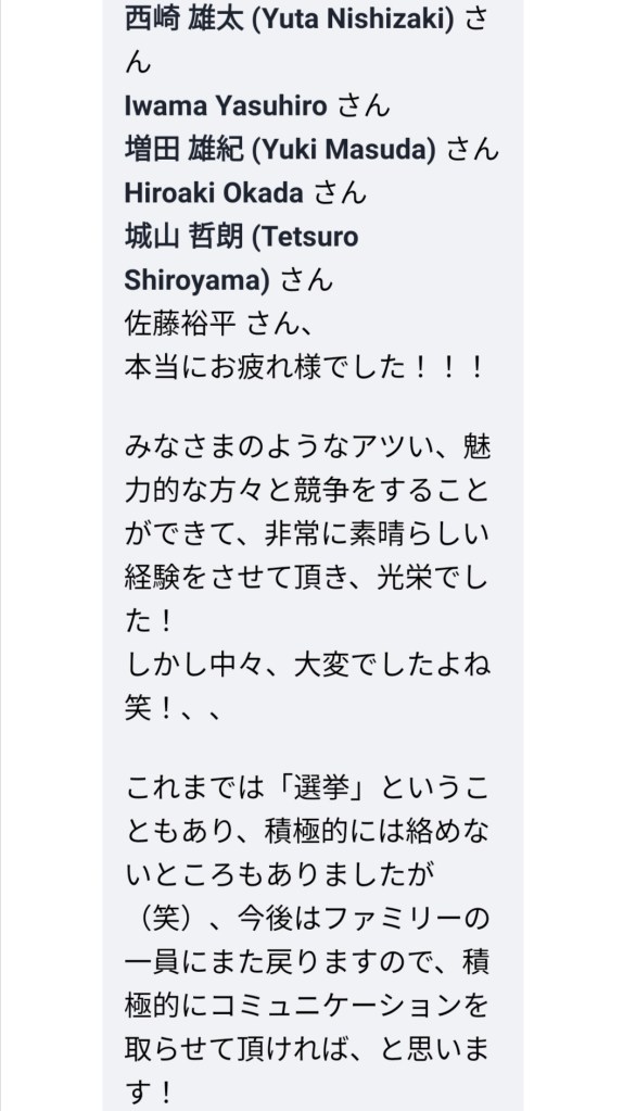 そして、GM選挙では惜しくも2位と言う結果になってしまった白石さんですが、選挙後も、共に戦ったライバル達、選挙を仕切って下さった選挙管理委員、自身に投票してくれたファミリーメンバー、そして運営者の方々へ向けて、素晴らしい人間性を魅せて下さいました。
