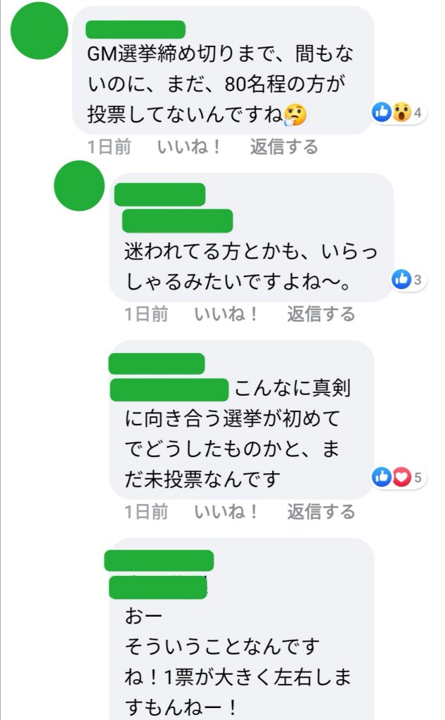 熱い想いがジ~~ンと心に響くほど、私自身も真剣にこのGM選挙と向き合っていたんだなと改めて感じることが出来ました*˙︶˙*)ノ”
