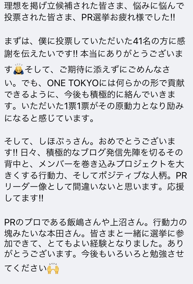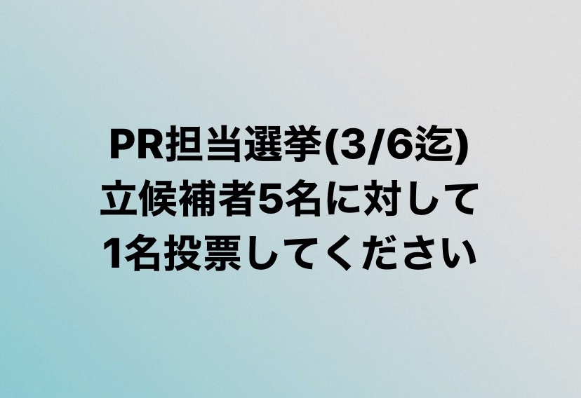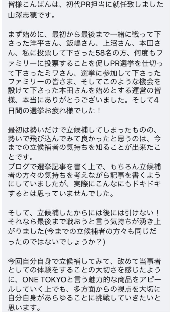 このPR担当トピックのコメント欄にはファミリーの方からもたくさんの質問があり(PRといっても幅広いですからね!)今回のPR担当業務はオンラインのみのPR担当と考えて頂ければと思います。尚、この選挙では1名の方が当選となるわけですが、今後1人で担うわけではなく、PR担当からさらに仕事の割り振りなどを他のファミリーに振っていくことも可能、また各担当の方やファミリーの方とチームを組み発信していくことも可能となります。