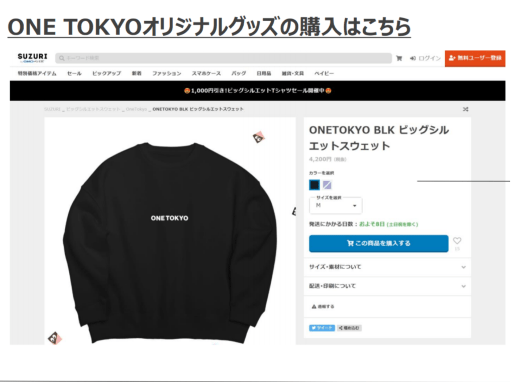 今回の企画にあたり、ONE TOKYOオリジナルアパレルグッズを製作されているSUZURIさんが全面協力してくださり、Tシャツを提供してくださいました。