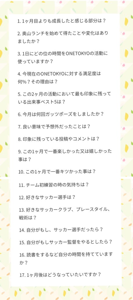 以上17項目にわたる質問に答えて頂きましたが、奥山大さんのお人柄がよりわかる内容、そしてONETOKYOが前に進んでいく様子が垣間見えたのではないでしょうか(*’▽’*)♪興味で留まっている方は是非一緒にファミリーになりましょう(✿´꒳`)ノ°+.*ファミリーになって頂ける方はこちらからお願いします👇👇👇👇