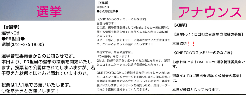 「ONE TOKYOでは基本、担当リーダーは選挙で決めています。だから監督はじめ、経験のない人が多数リーダーを務めています。これって斬新ですよね😱