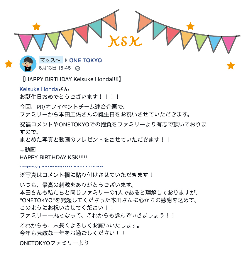 本田さんへのお誕生日お祝い投稿↓