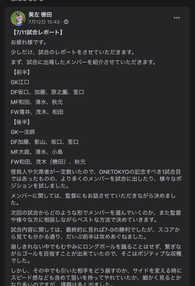 コーチを兼ねる轡田選手からは試合翌日に詳細なレポート!メンバーの意図、戦術の振り返り、課題と次への繋げ方など、読めておもしろかったです。