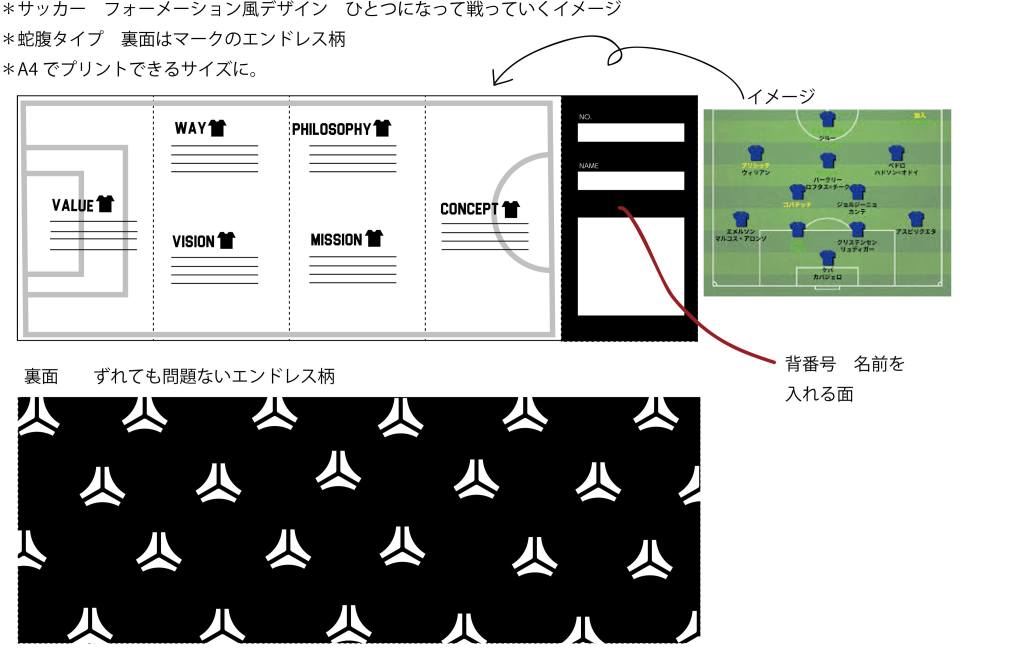 ↓まずは私案。やはりサッカーチームのクレドカードなので、サッカーのフィーメーションをイメージ。