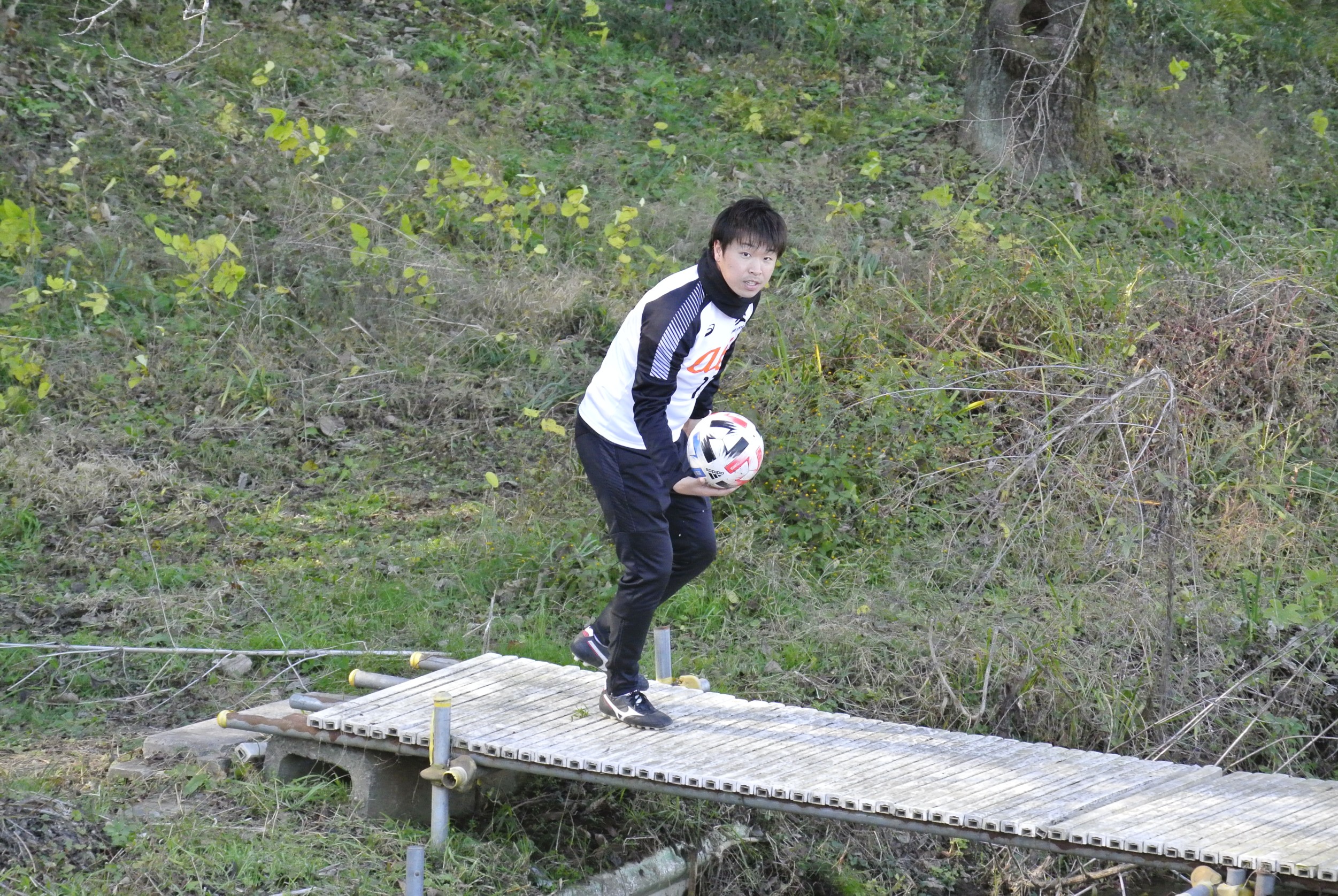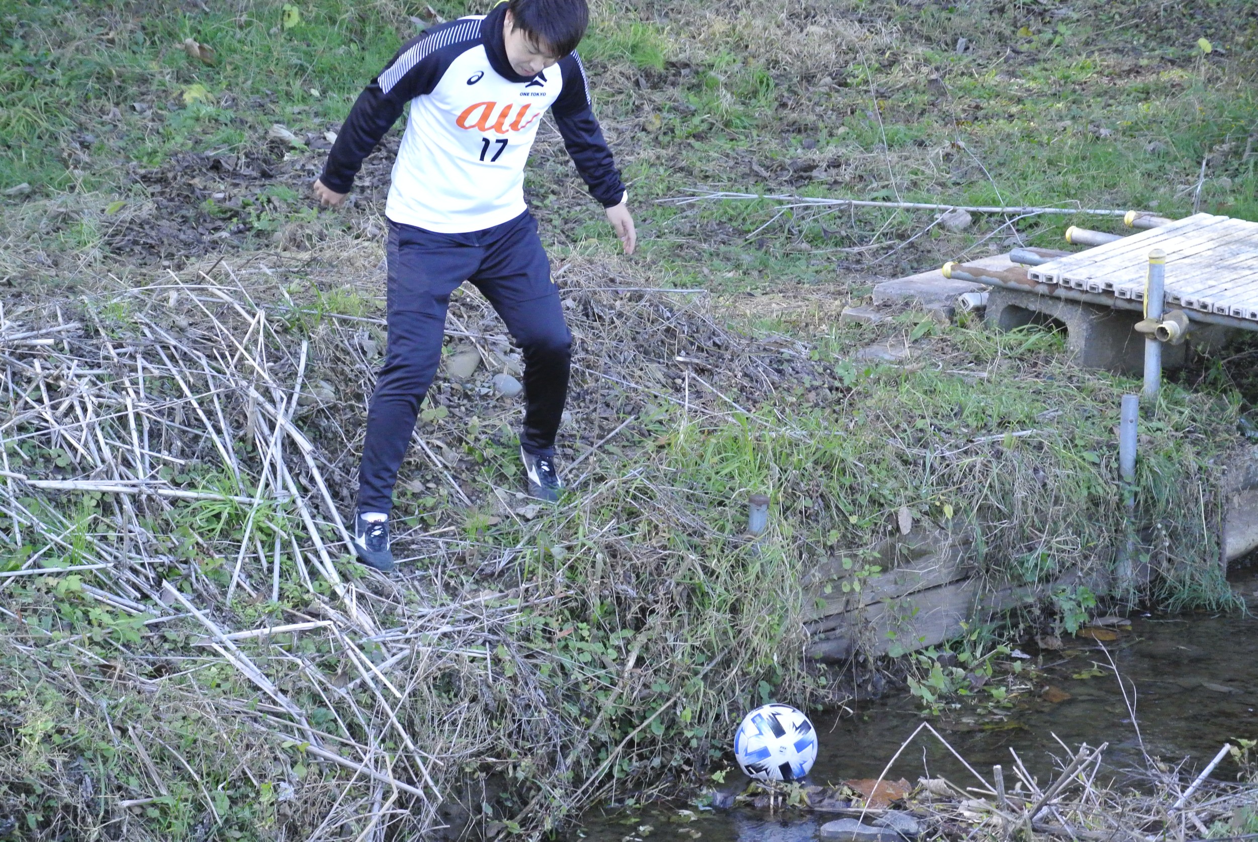 グラウンド横の川に落ちてしまったボールを拾う青柳燎汰選手(FW#17)