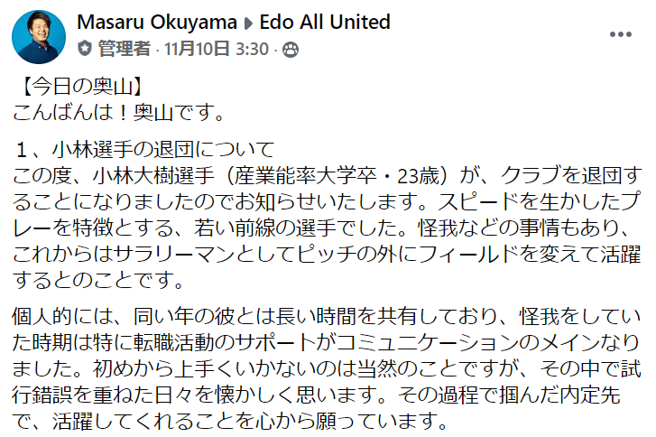 - 小林大樹選手退団