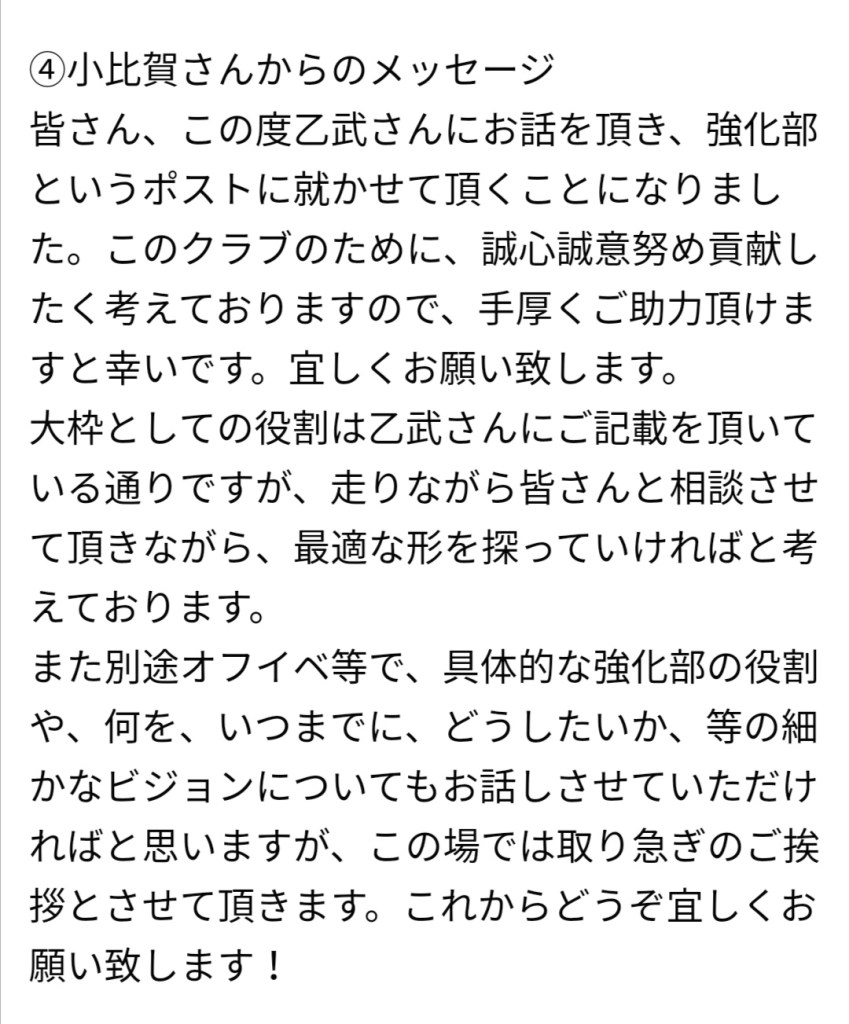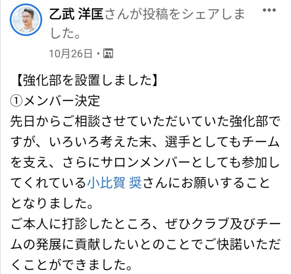 👩初年度、副将としてチームを牽引してきた小比賀奨選手。ご存知の方も多いかと思いますが、サロン参加もされていて、これまでもアクティブに様々な発信をされて来ました。選手としてチームを纏め上げる現場を知っている立場であること。サロン内発信の受け応え等からも小比賀選手は強化部リーダーとして適任だと感じました。