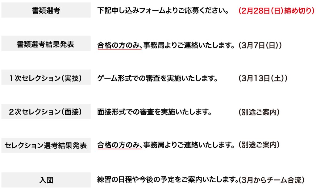 ・セレクション中の怪我や事故の応急処置は行いますが、その後の対応は各自で行ってください。