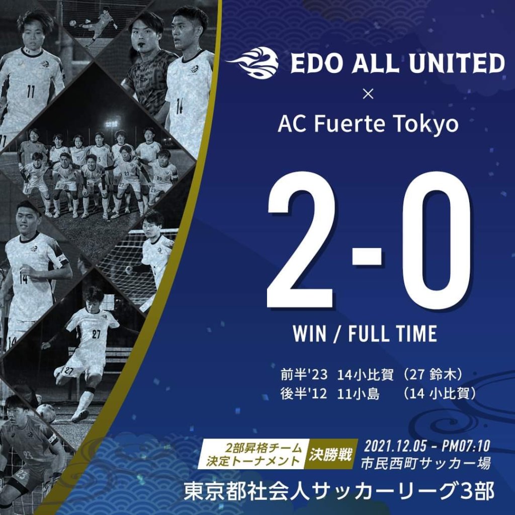 タイトル画像の歓喜のシーンでお分かりかと思いますが、優勝しました🏆🙌🙌🙌🙌🙌🙌2部昇格です!!!! EDO公式SNSや選手、familyの投稿で結果をご覧になった方もいるかと思います。こういった記事は経過報告してから結果をお伝えするのが通例になっているようですが、今回私の独断で敢えて逆をついてみました!当日の写真や選手・familyの熱い想いや歓喜の声と共に決戦の様子をお楽しみください!