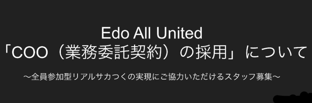 あらゆる庶務を執行し、サッカークラブとしてEDOを前に進められる「COO -最高執行機関責任者」の募集をする事となりましたので、募集要項等、併せてお知らせ致します。【有償での採用となります】