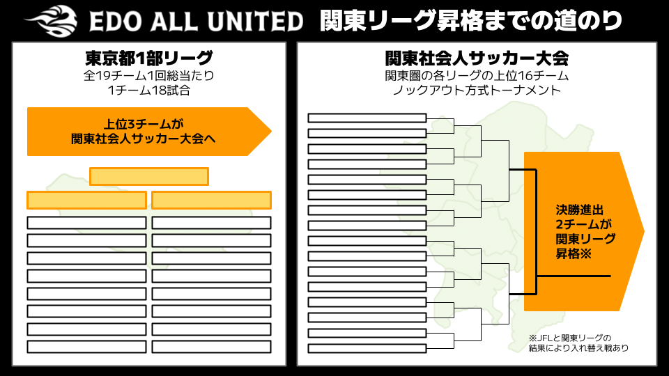 ※JFL/関東リーグの結果によっては、関東社会人サッカーリーグのクラブと入れ替え戦がおこなわれ、勝利する必要があります。