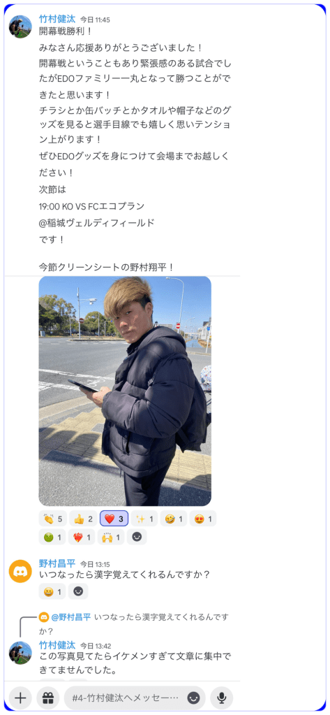 【アナウンス】や【監督によるマッチレポート】のように読み物としてお楽しみいただけるチャンネルの他【選手チャンネル】等、ファン会員の皆さまにもメッセージでご参加いただけるチャンネルが多数開設されています。 今回は参加型チャンネルの中から少しピックアップして中まで見ていきたいと思います。